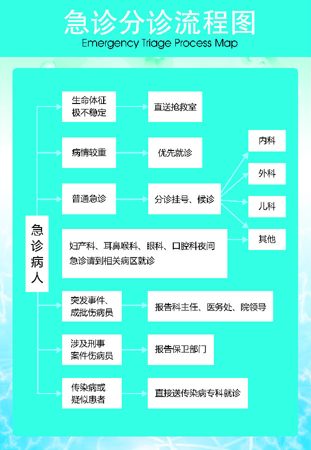 3、初到急诊,可询问急诊大厅预检台护士,以便能及时分流到专科急诊就诊;诊疗全过程中,如遇到问题均可询问预检台护士。